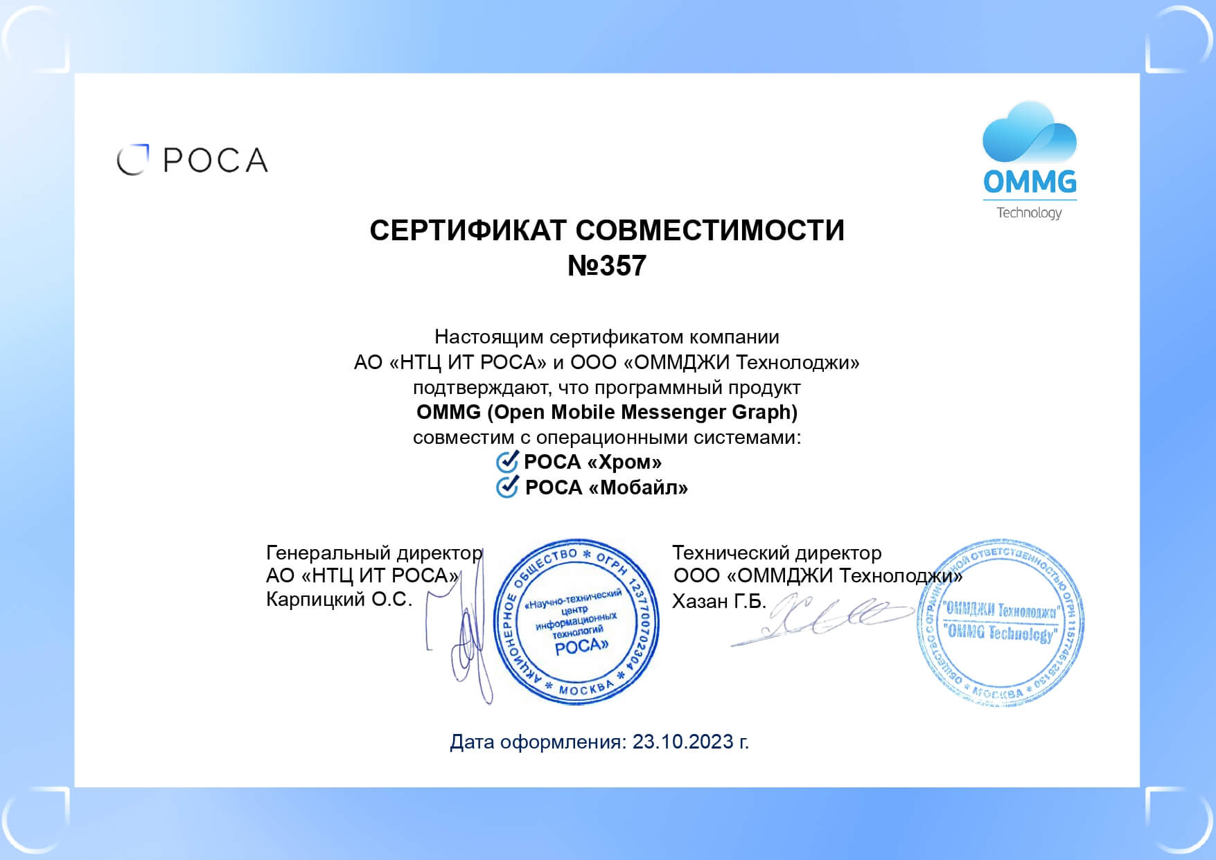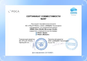 OMMG (Open Mobile Messenger Graph) О компанииО компании: Open Mobile Messenger Graph — коммуникационная платформа для создания собственных сервисов общения – мессенджеры, системы передачи файлов, системы передачи голосовых сообщений, ГЕО, ВКС, Private Cloud, шифрование. СЕРТИФИКАТЫ