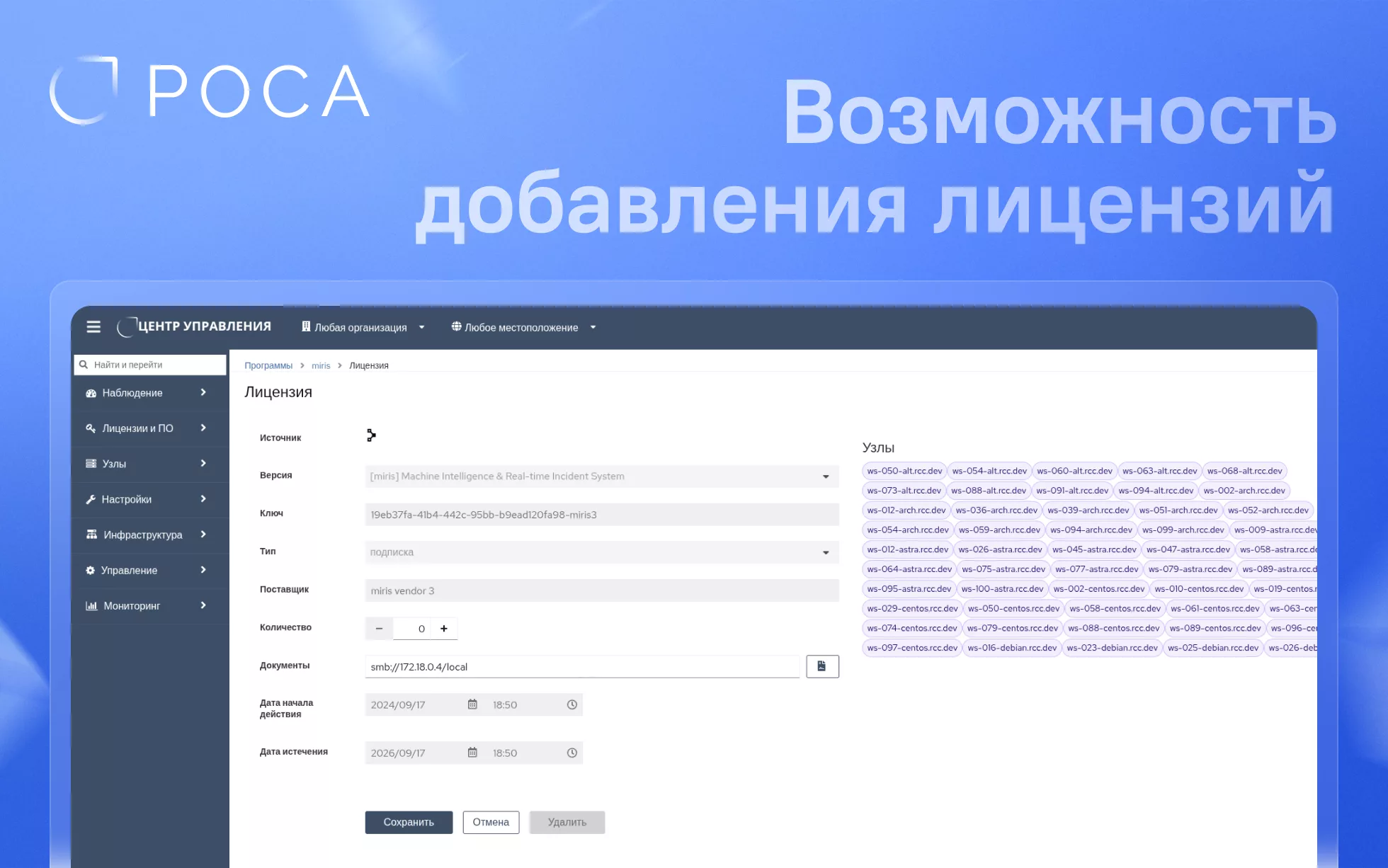 Для администраторов инфраструктуры в версии 2.5.0 добавлен онбординг-гид, упрощающий первичное освоение платформы. В модуле учета лицензий реализована возможность ручного добавления лицензий с указанием физического или цифрового места хранения подтверждающих документов, что упрощает подготовку к аудитам и проверкам. Для Linux-сред введен контроль прав sudo, а функция распределения узлов повышает отказоустойчивость и гибкость архитектуры при масштабировании.